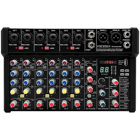 La TM 62 BU-DSP intègre un processeur DSP 24 bits / 48 kHz avec 99 effets numériques. Ces effets incluent réverbérations, delays et autres traitements audio essentiels pour enrichir le rendu sonore.