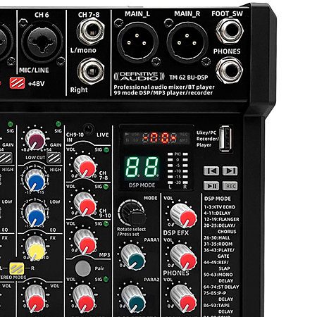La console mixage 9 canaux Definitive Audio TM 62 BU-DSP est conçue pour les DJs, musiciens et techniciens recherchant une solution compacte et polyvalente. Elle permet de gérer facilement plusieurs sources audio lors de prestations live, en studio ou en podcast.